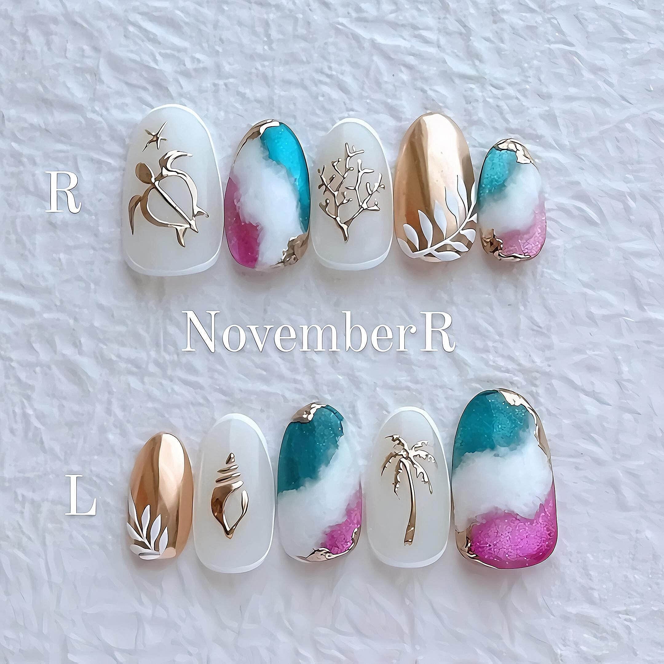 海やリゾートモチーフの手書きミラーアートも可愛いネイルチップ