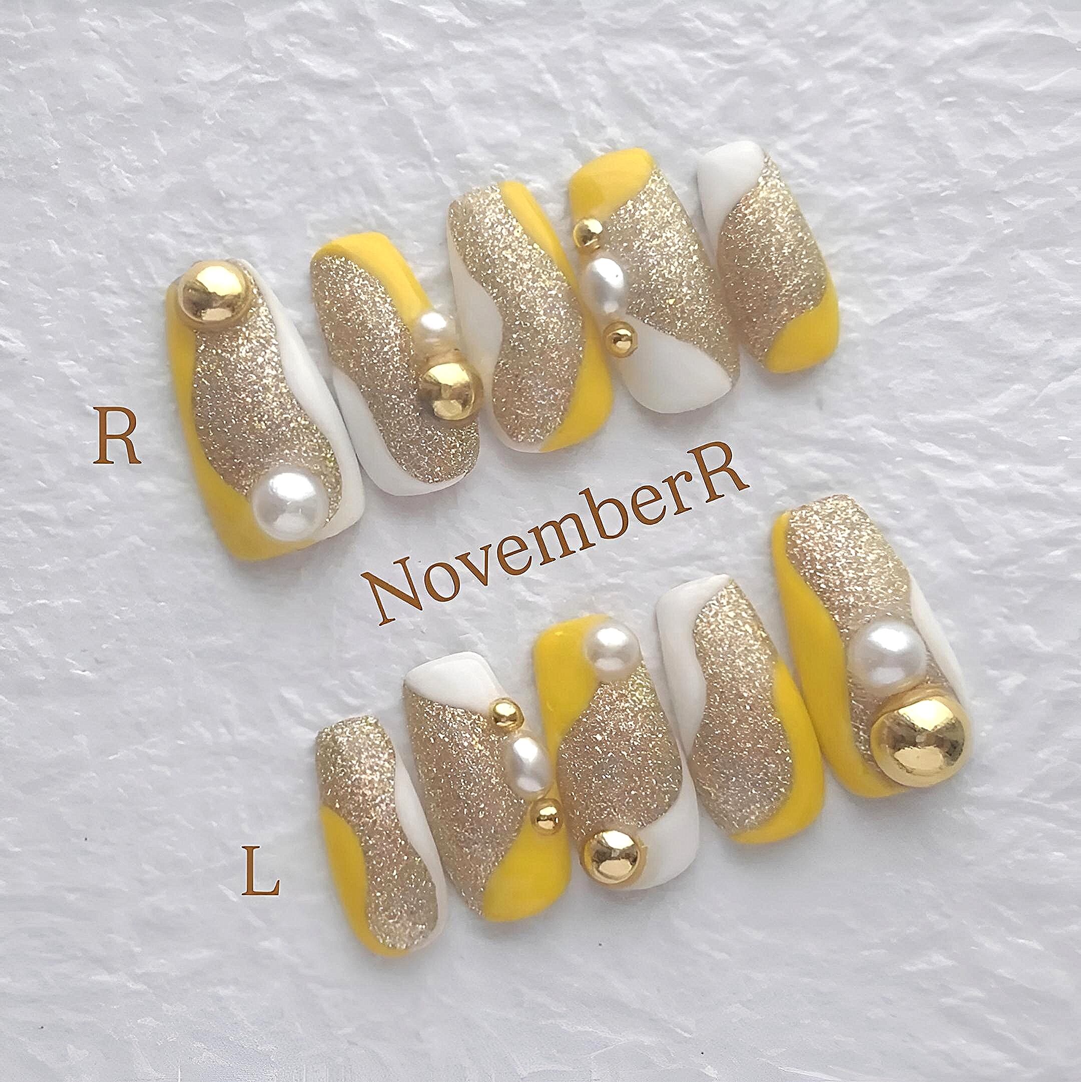 イエローとホワイトの微妙なバランスのうねうねデザインと人気のフラッシュネイル!