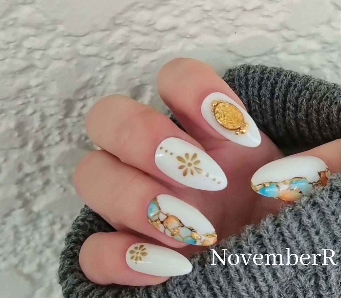 ホワイトベースにオイスターカッパーターコイズを軽めにアート!エスニック風に仕上げました⭐︎