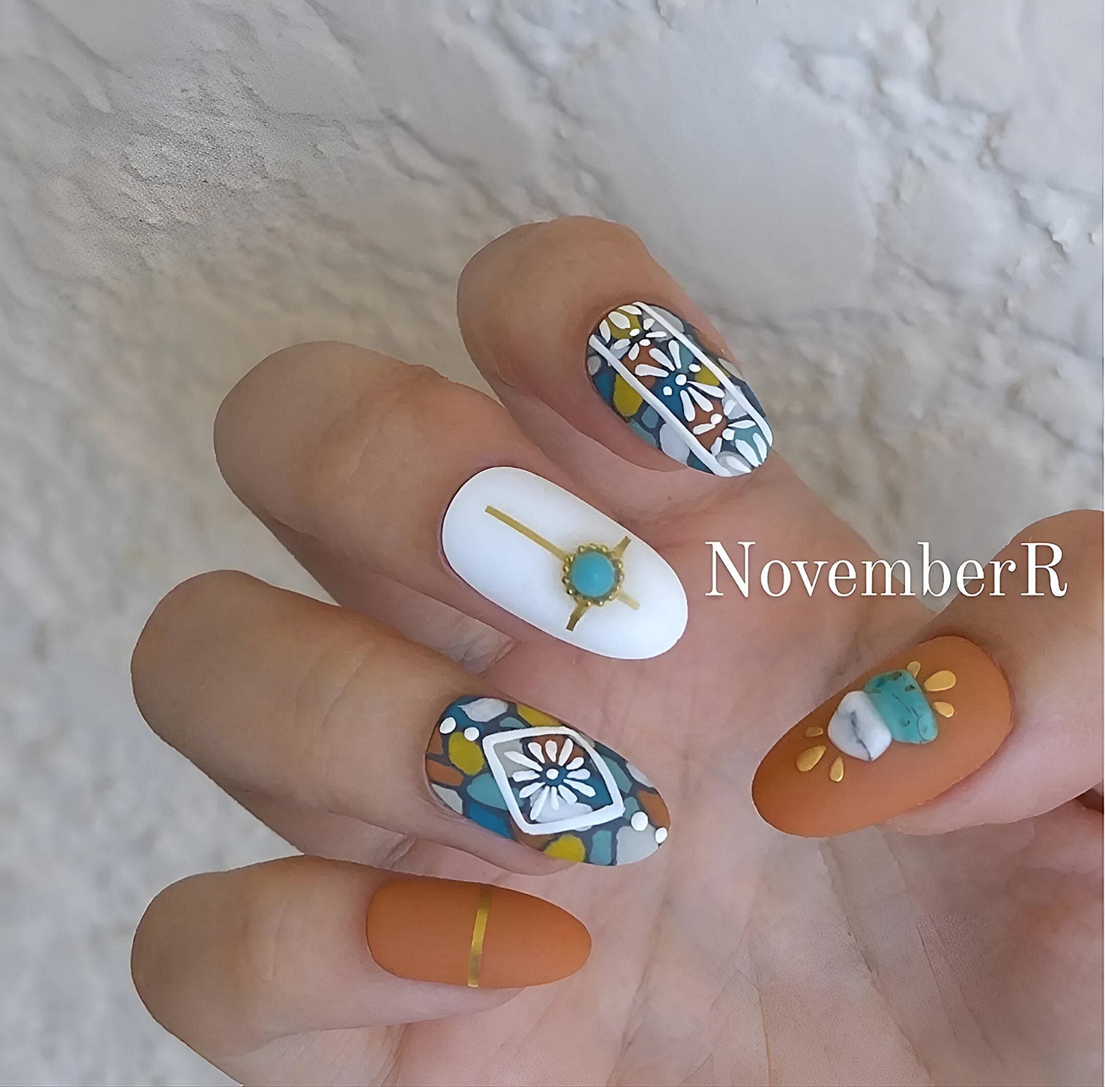全体的にマット仕上げの大人なエスニックリゾートネイル⭐