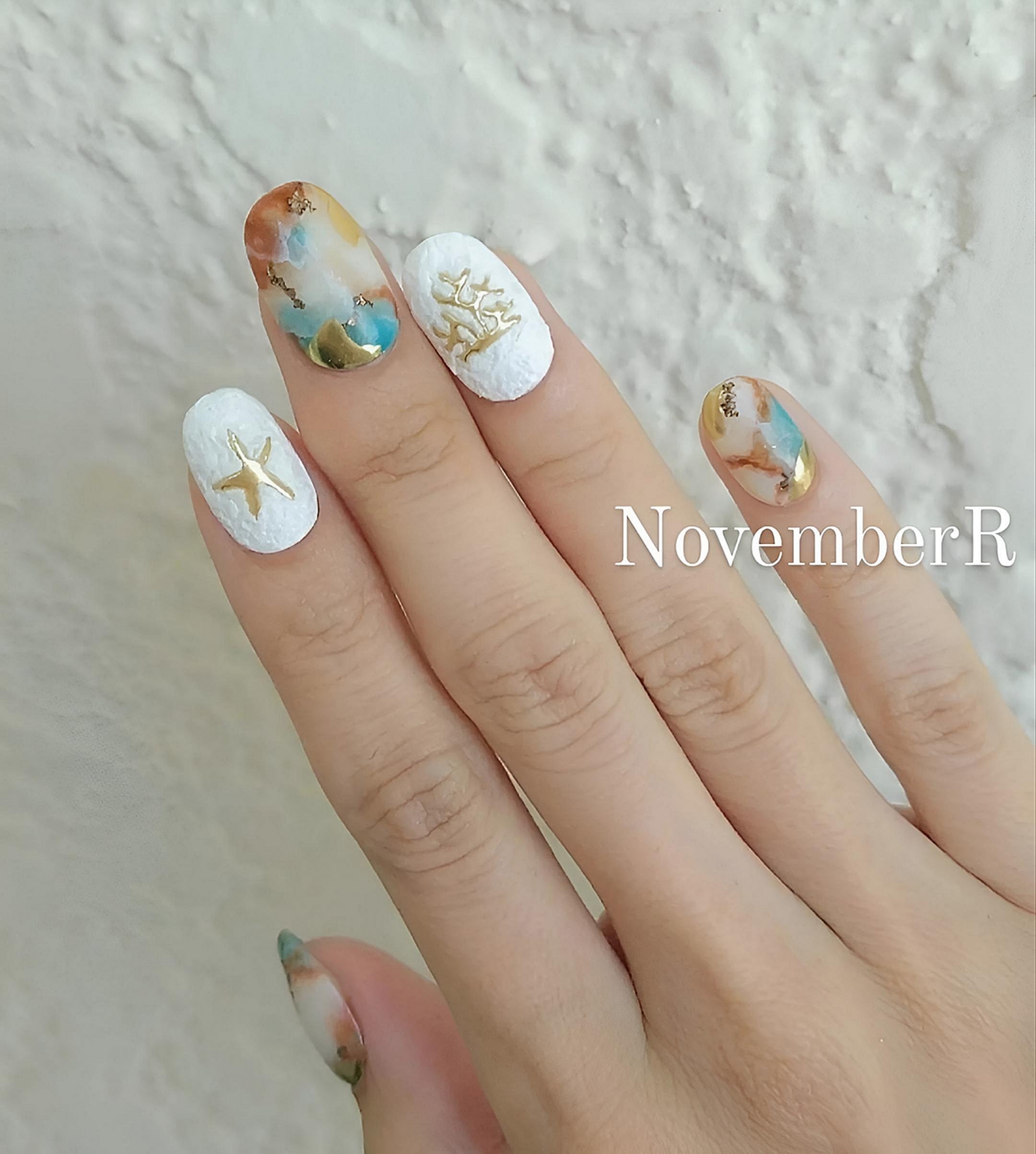 オイスターカッパーターコイズ風&漆喰風のモコモコしたデザインにゴールドミラーでシェルやヒトデなど手書きアートで夏にピッタリのネイルチップ!