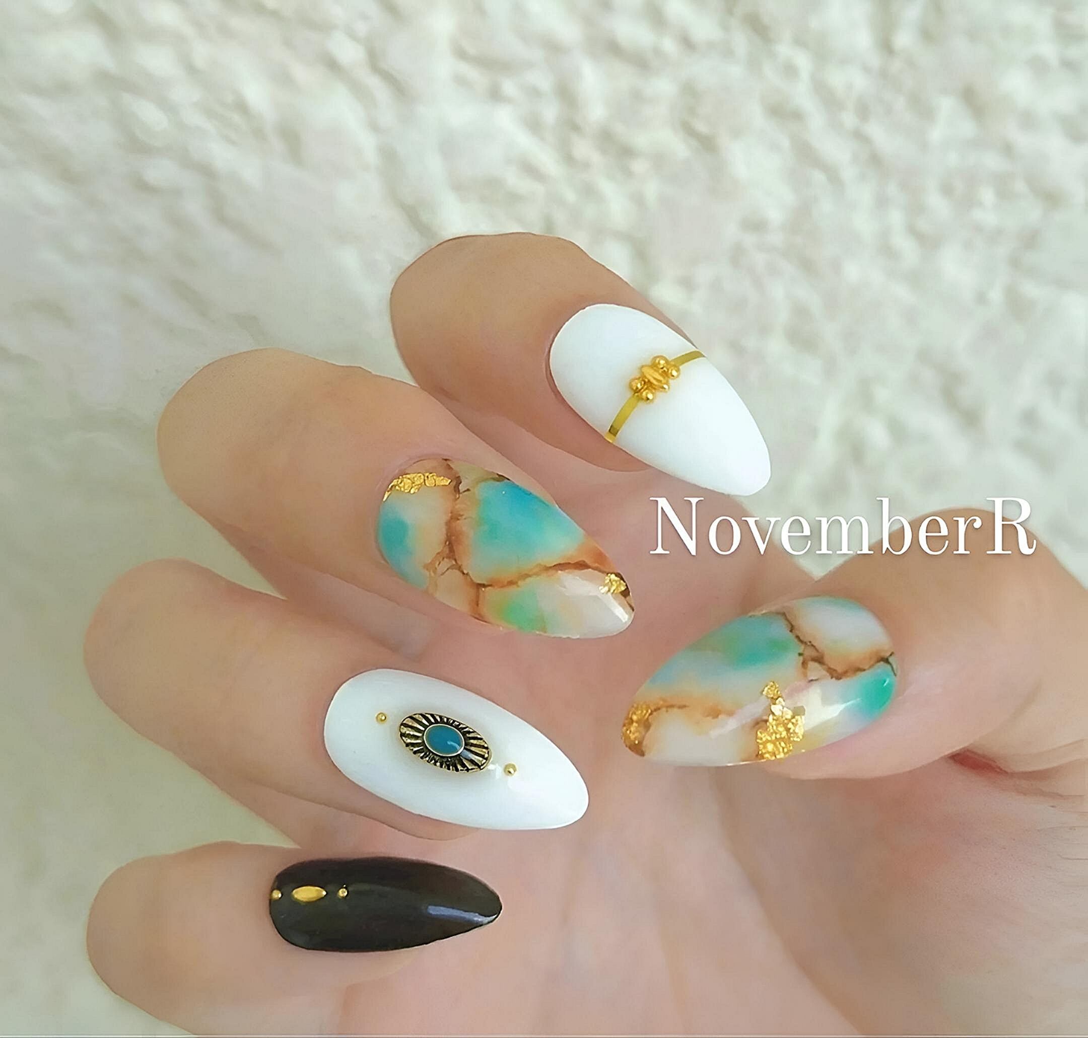 金箔をちらしたオイスターカッパーターコイズ風のニュアンスアート