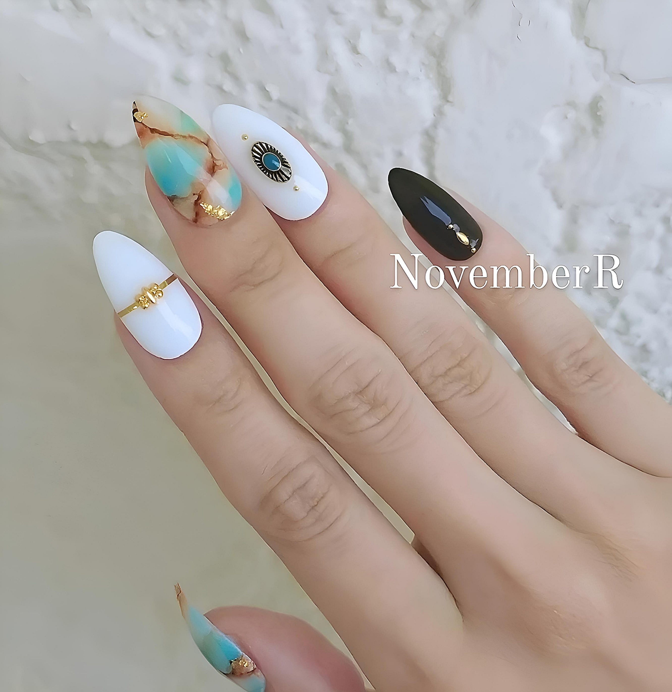 ホワイト&ブラウンベースにターコイズのコンチョとゴールドパーツを!リゾートにもオススメな大人夏ネイル⭐︎