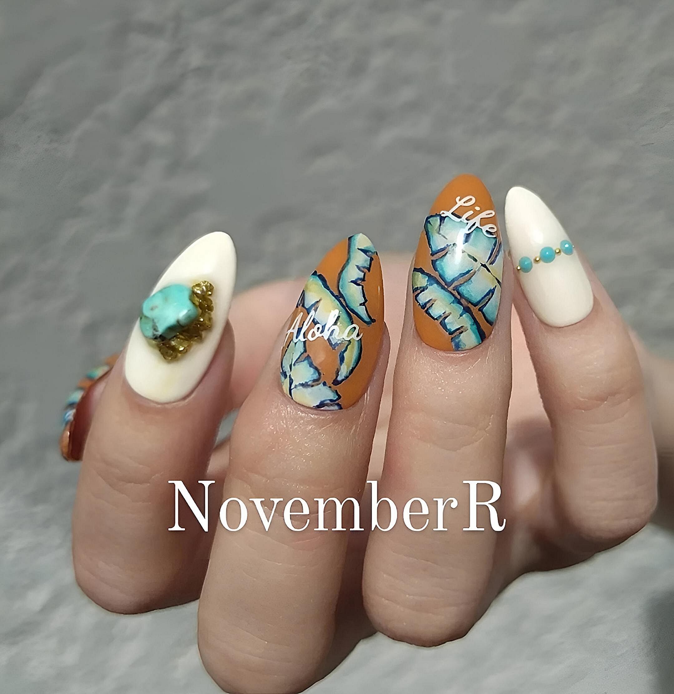 LA389★手書きボタニカルリーフ&モロッカンのリゾート風ネイルチップ