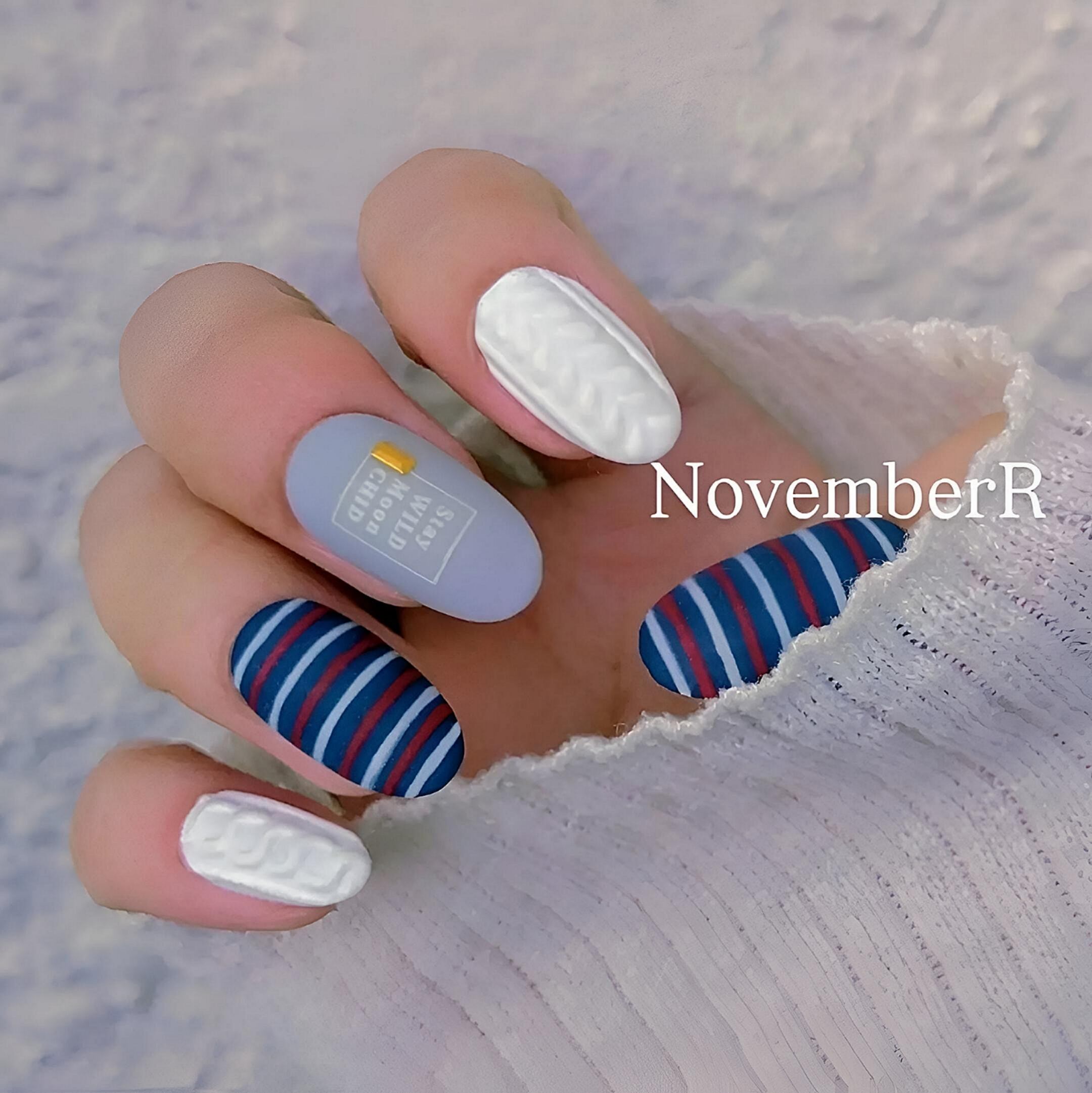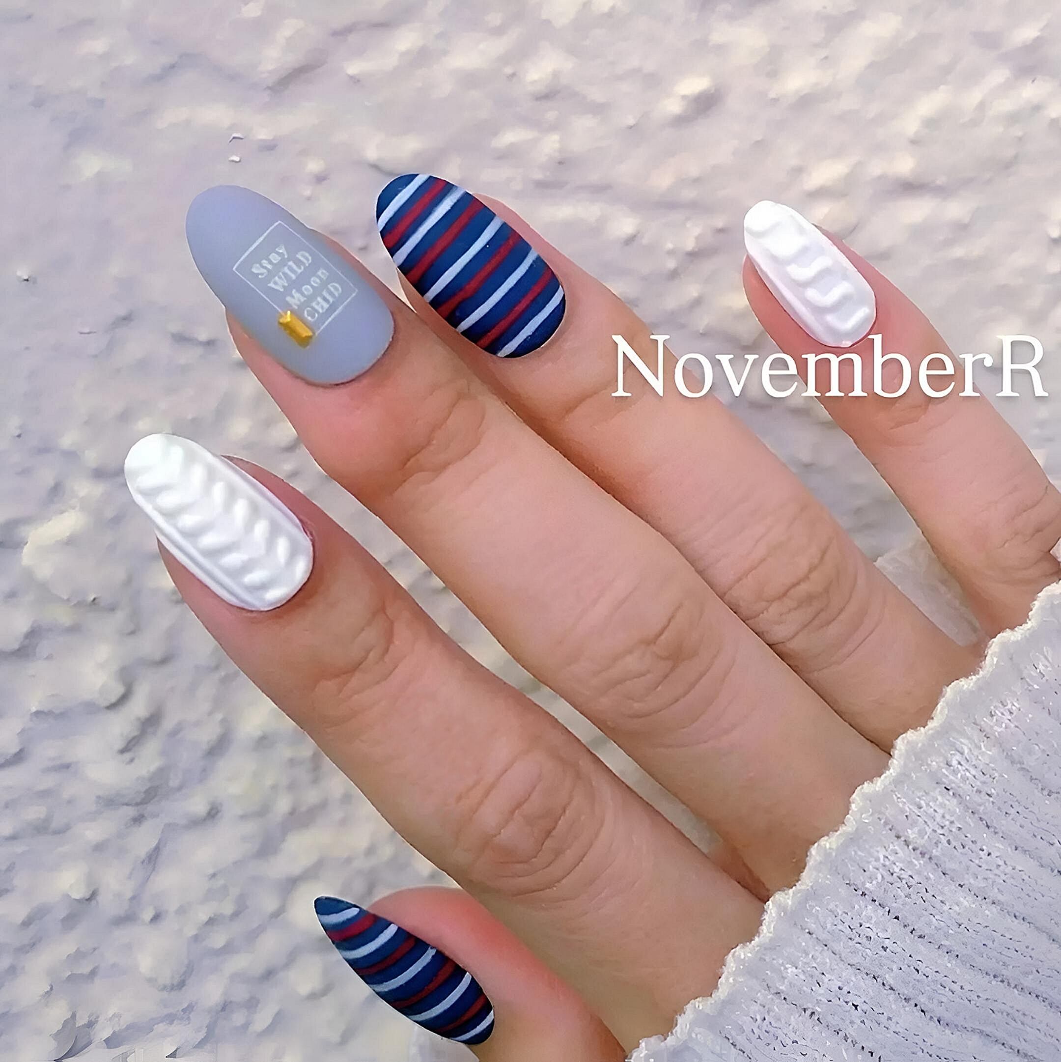 ぷっくりニットネイルとビーチスタイルのボーダーデザインの西海岸風サーフネイル⭐︎