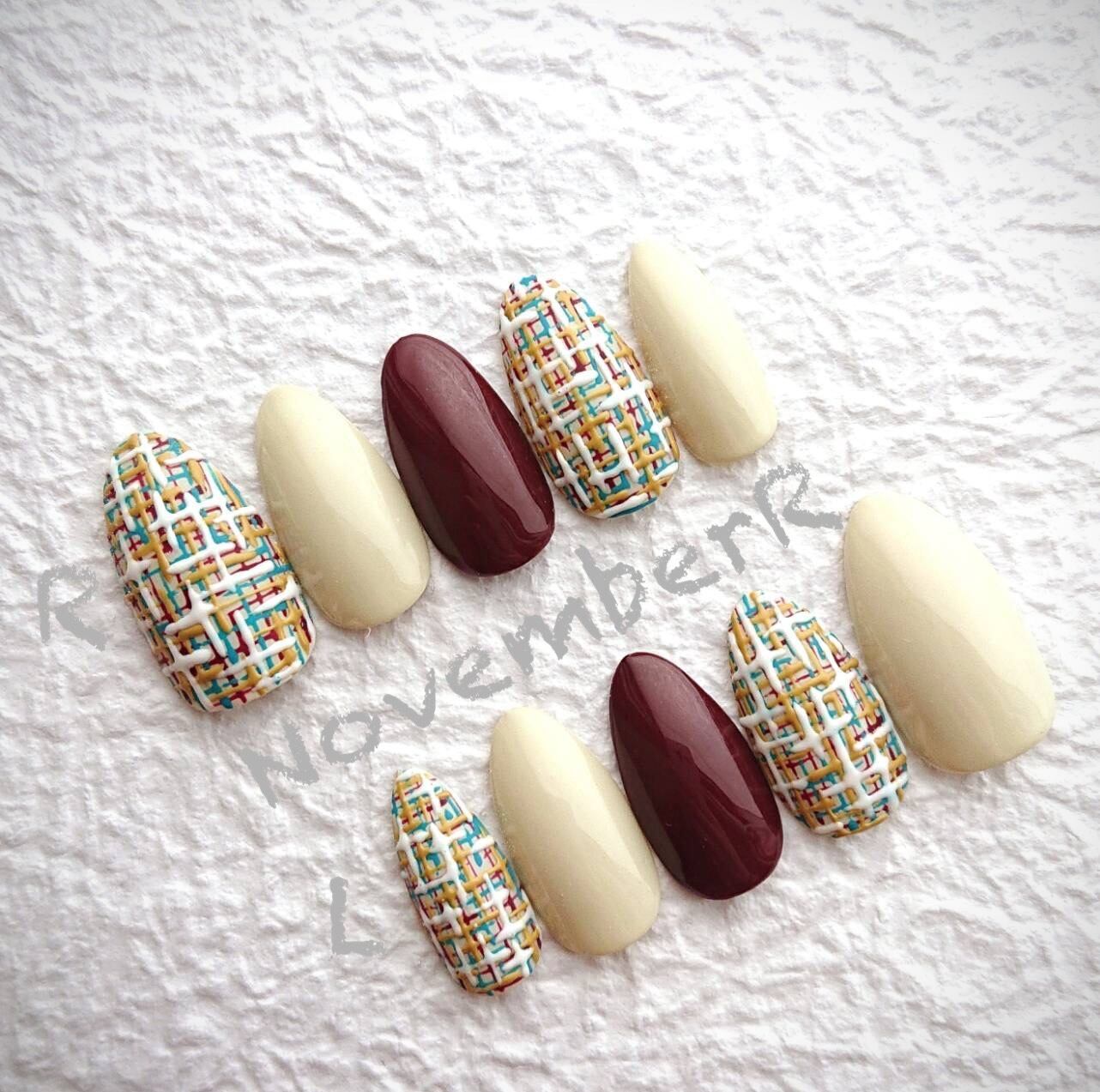 オフホワイトとボルドーのワンカラーとマルチカラーツイードネイルを合わせたシンプルな綺麗め大人ネイル⭐︎