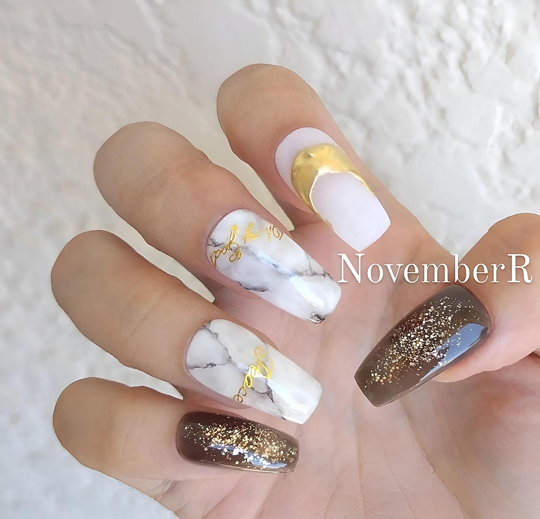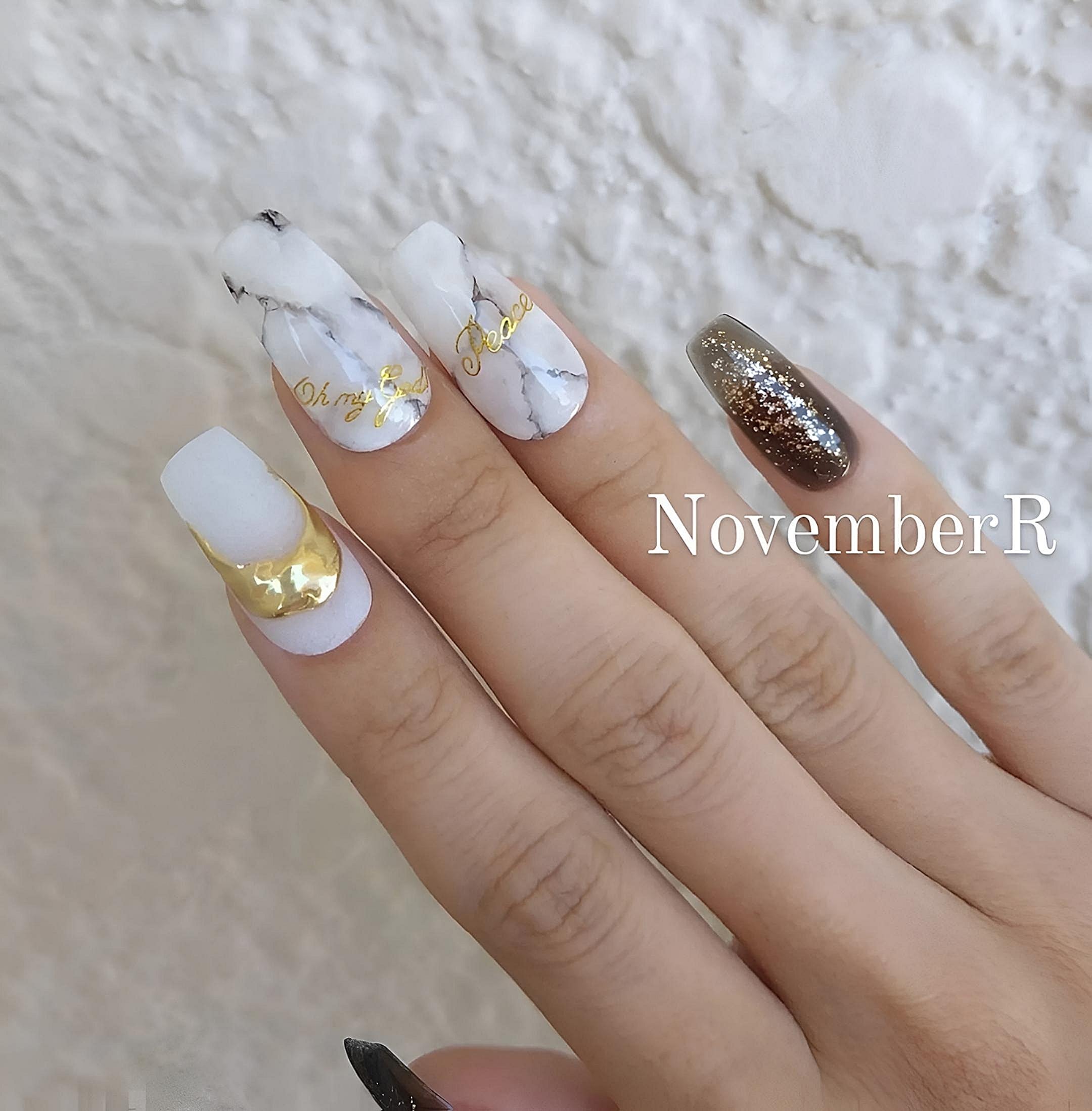 手書きの奥行きのある大理石ネイルに英字シールとマットなシーグラス風ホワイトにゴールドミラーのリングネイル、黒シースルー×ラメの大人おしゃれな大理石ネイル