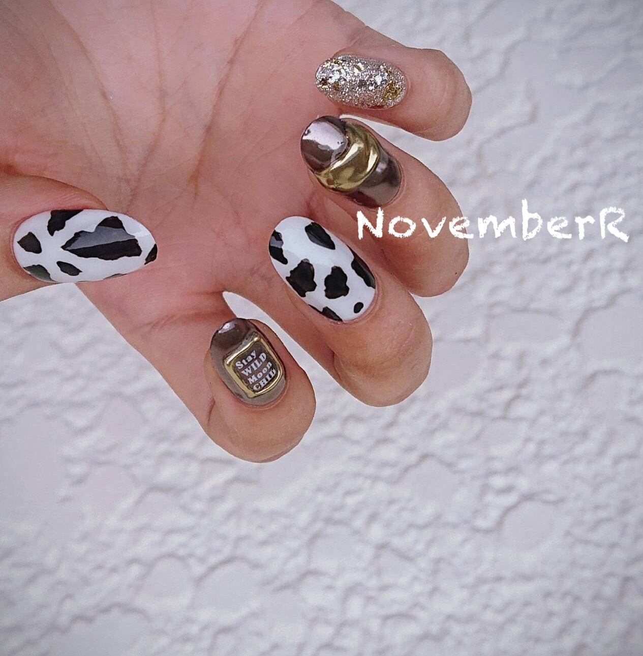 ホルスタイン柄と金箔ラメのワンカラー、ブラックとゴールドのミラーを使ったニュアンスリングなど個性的なデザインがかっこいい、おしゃれアニマルネイル⭐︎