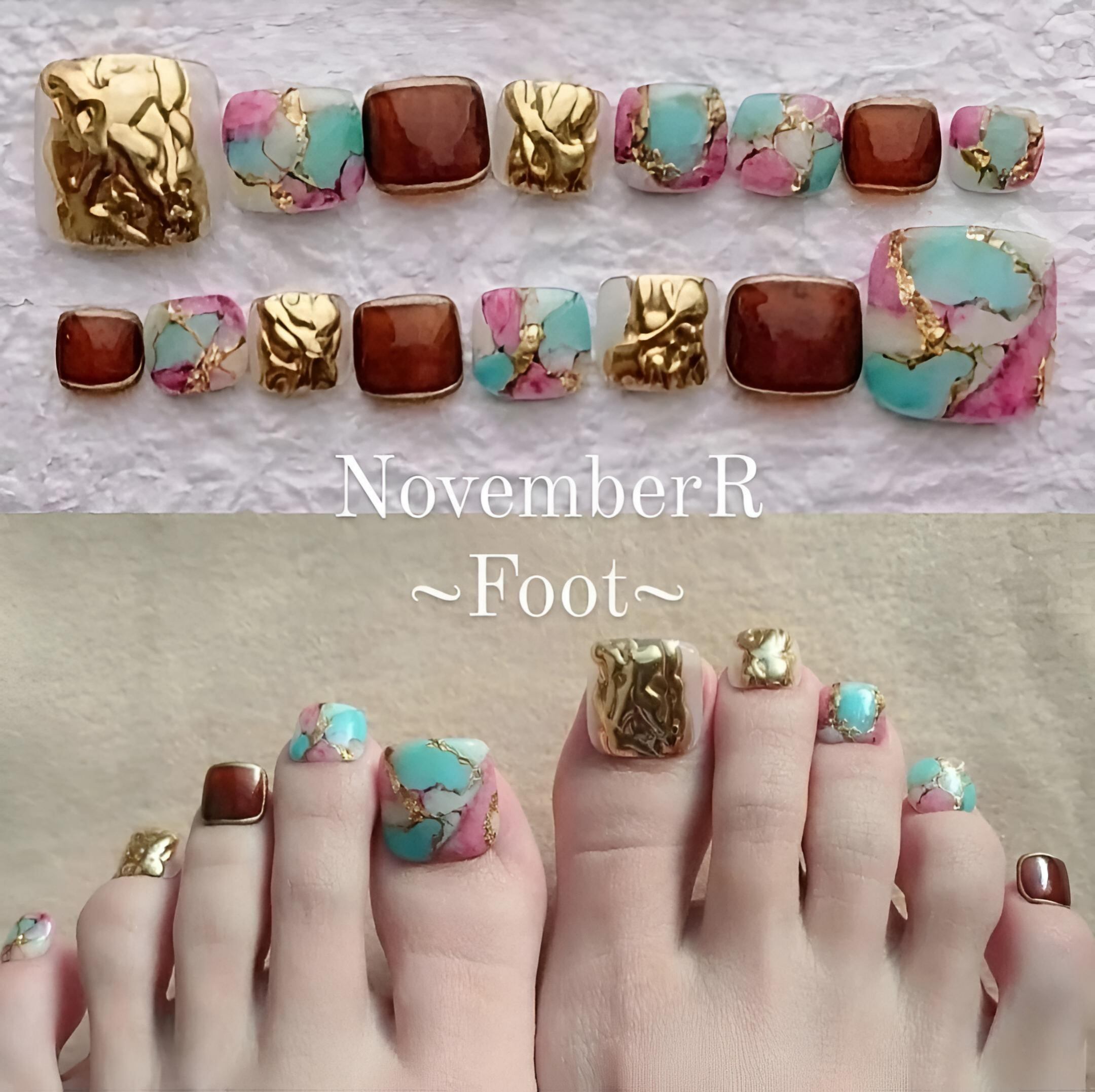 オイスターカッパーターコイズ風アートとクリアベースをマットにしゴールドミラーのぷっくりニュアンスデザイン、赤みのあるクリアブラウンのワンカラーはゴールドで囲み、大人っぽいエスニック風フットネイルチップ⭐︎