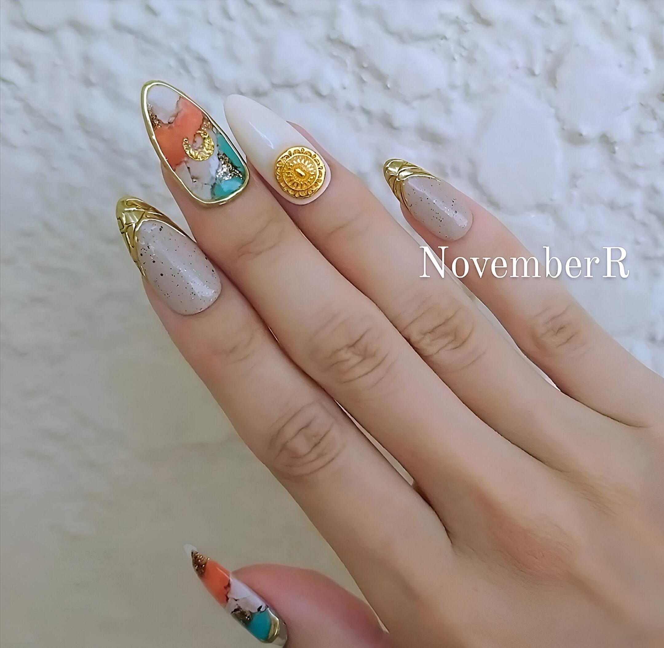 手書きのオイスターカッパーターコイズをゴールドミラーで囲み、砂ジェルはミラーフレンチネイル、ミルキーホワイトには大人かっこかわいいパーツのエスニックネイル