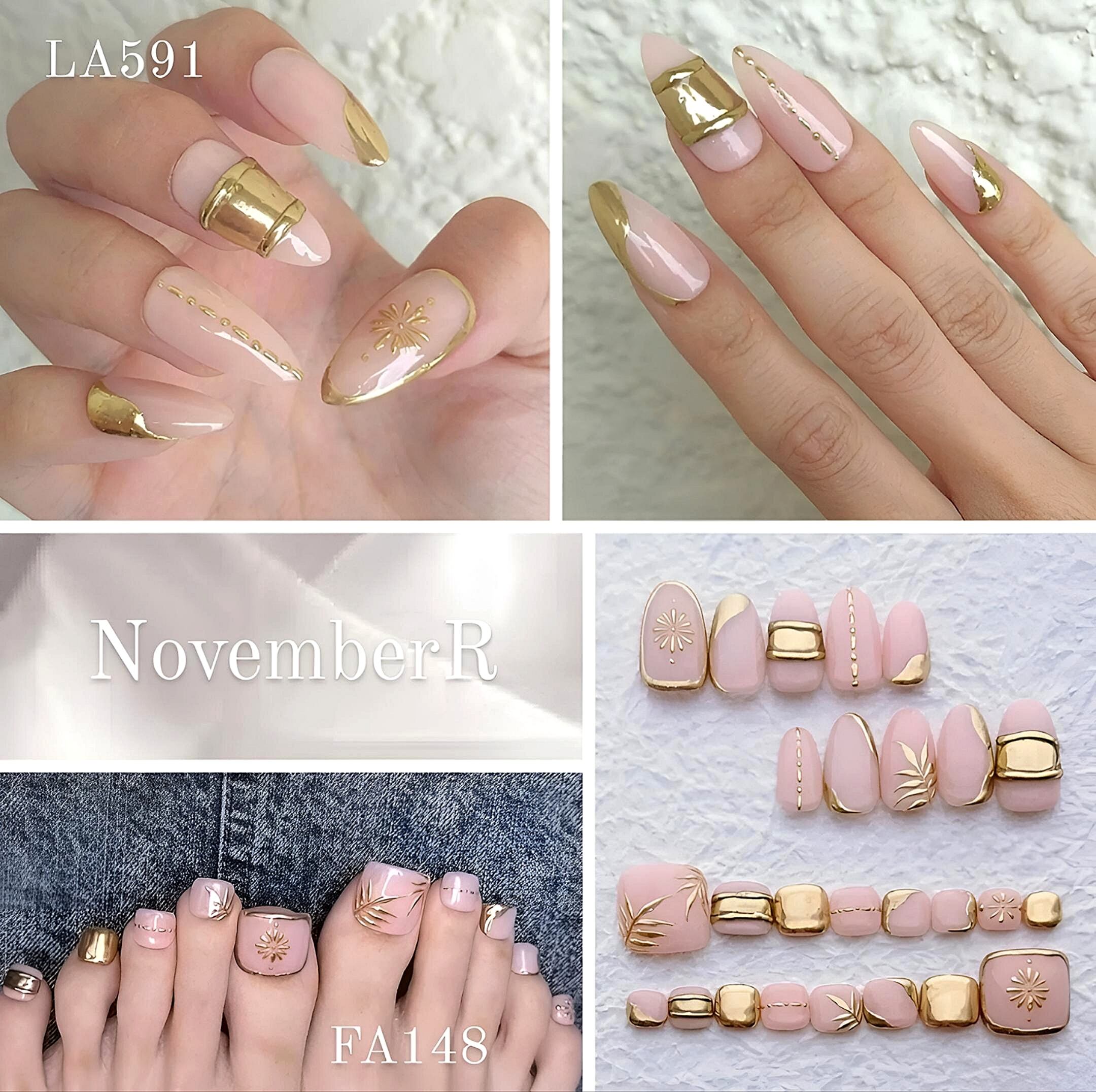 少しクリア感のある肌馴染みのいいピンクベージュにゴールドミラーでリングネイルやタイル柄、ボタニカルリーフなどのアートをした大人おしゃれネイルチップ☆