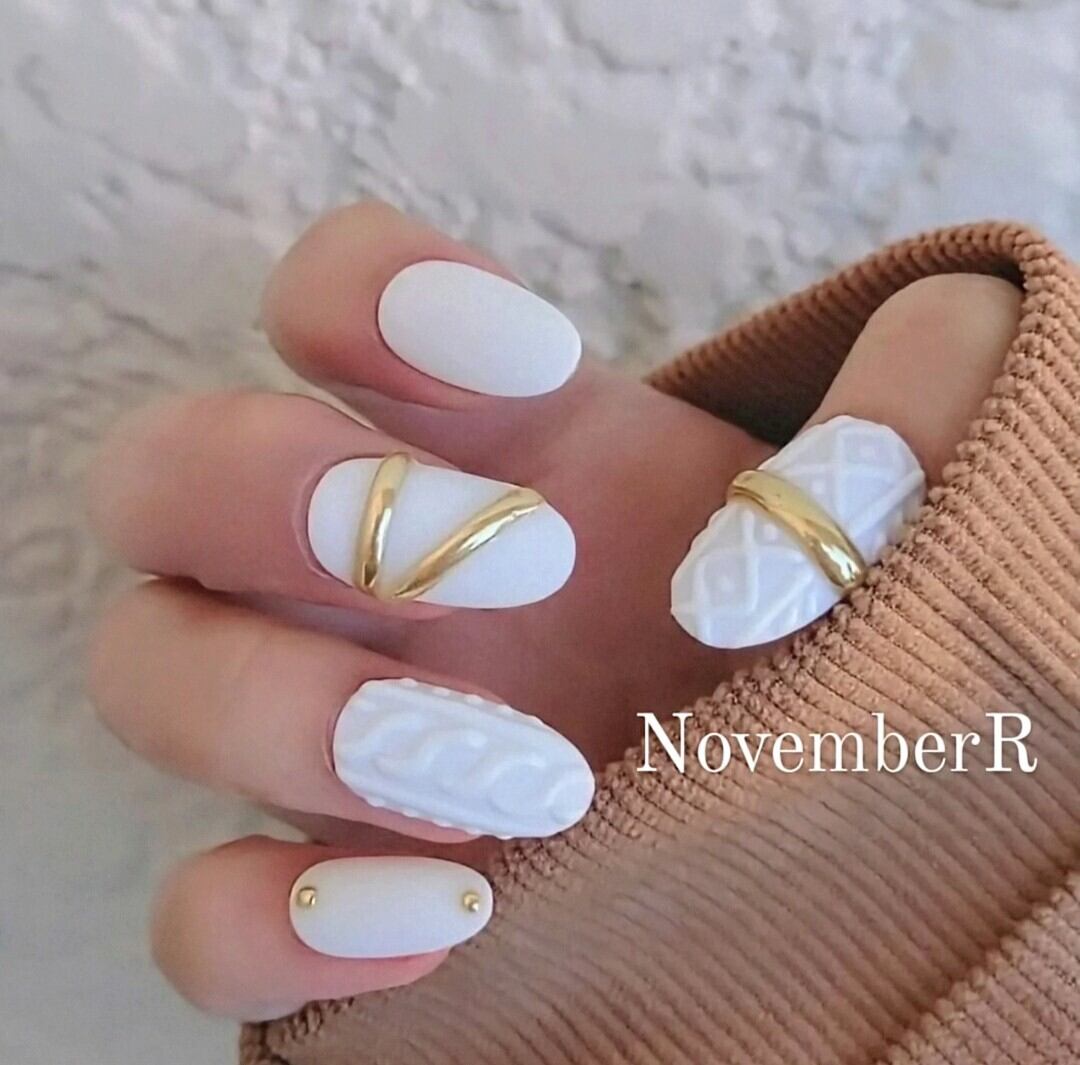 オールホワイトマットにニットネイルとゴールドミラーのリングネイルと囲みネイルおゃれな大人シンプル冬ネイル★