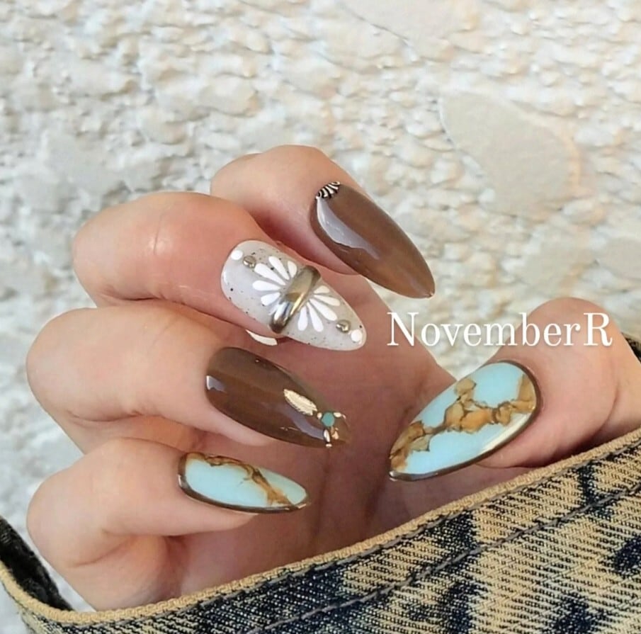 明るめの手書きターコイズとクリアブラウンのワンカラー、おしゃれな砂ジェルにポイントのシルバーミラーアート。