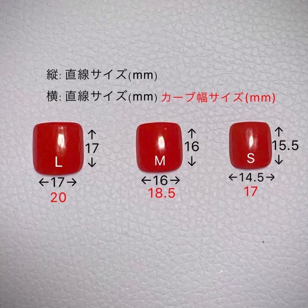 ※柔らかいメジャーで親指のお爪の1番広い所を丁寧に測りサイズ表をしっかりご覧になって下さい。