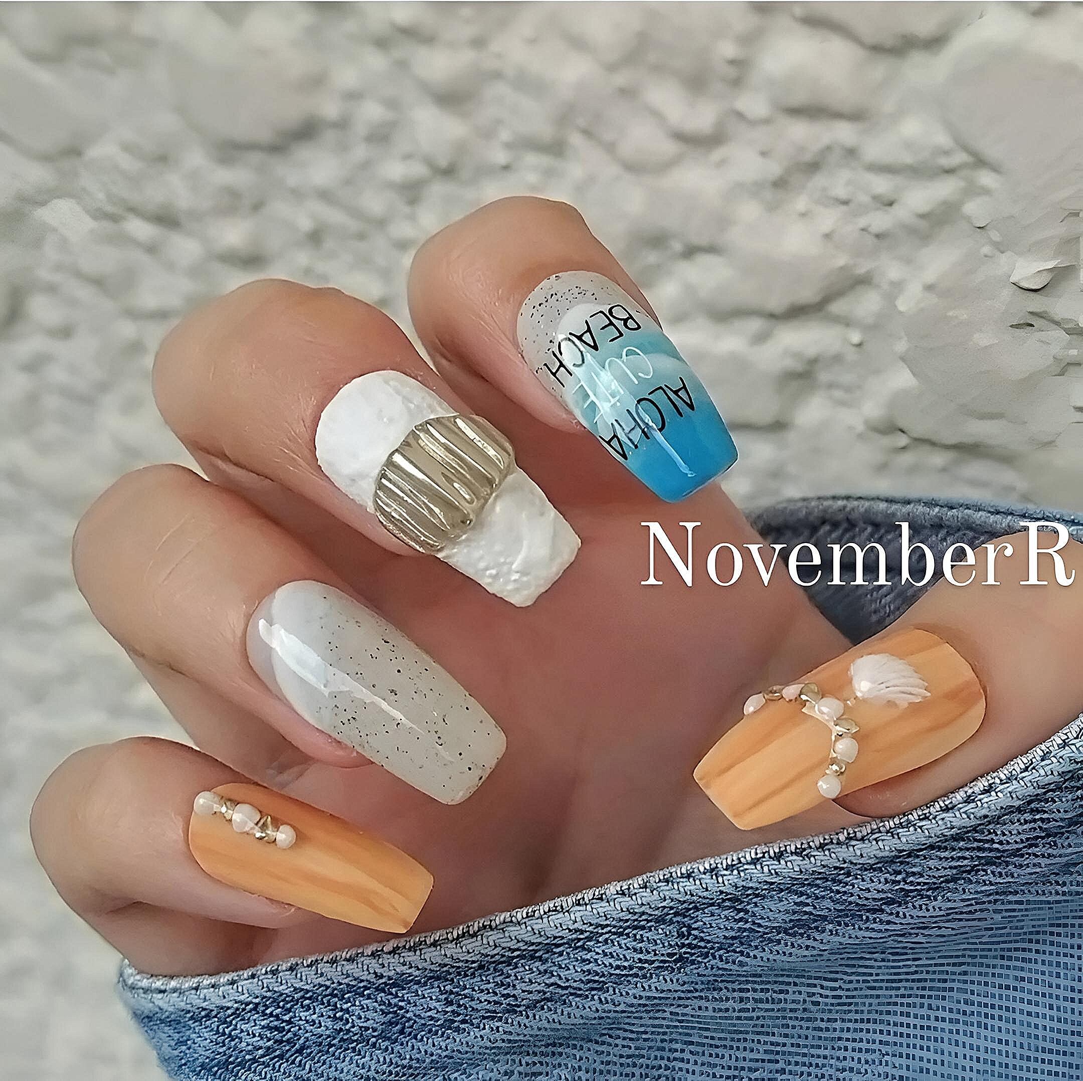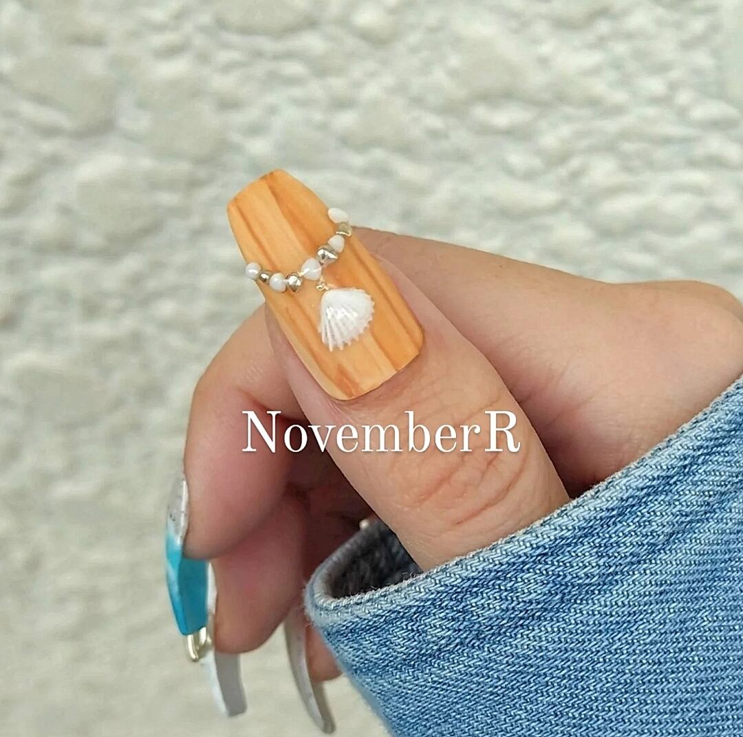 ウッド柄にジェルで作った貝殻を乗せ、さざ波アート、漆喰風のデザインにはシルバーミラーのリングネイルで可愛い夏ネイル。