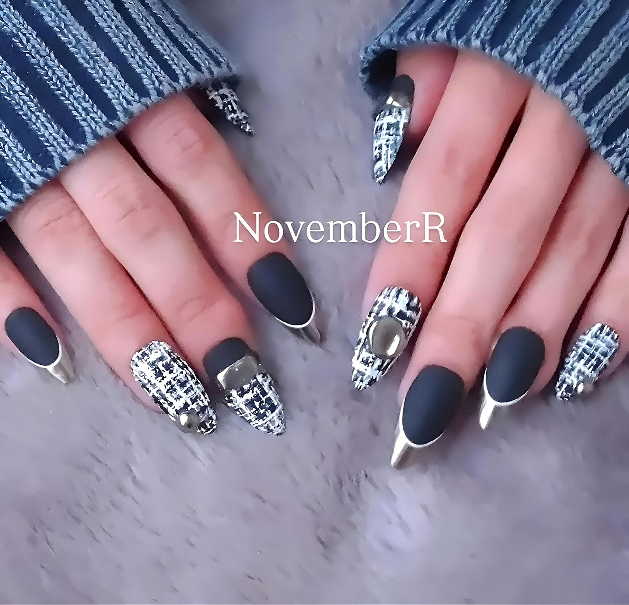 LA713★大人ツイード×シルバーミラーネイルチップ