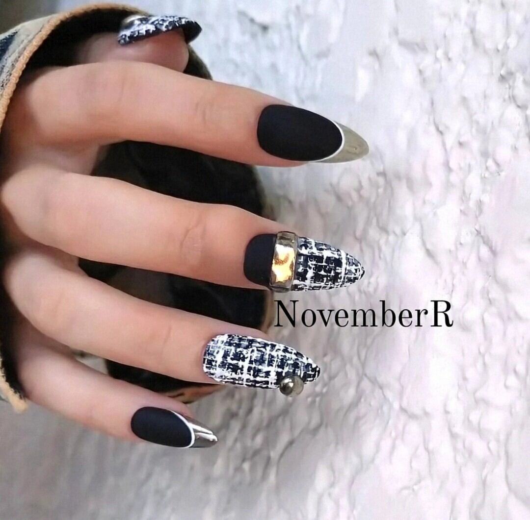 黒と白、シルバーでまとめたツイードネイル