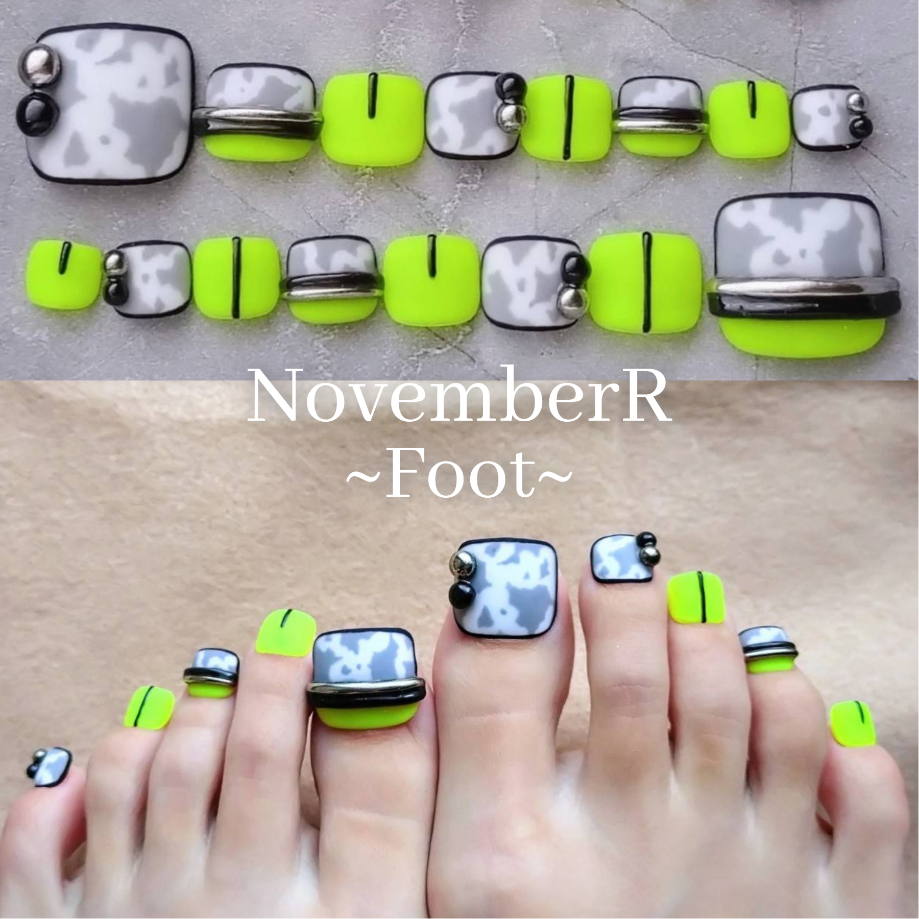 グレーの落ち着いた牛柄とクリアを混ぜ派手すぎないネオンイエロー。黒とシルバーが効いてる大人カッコいいデザインのフットネイルチップ!