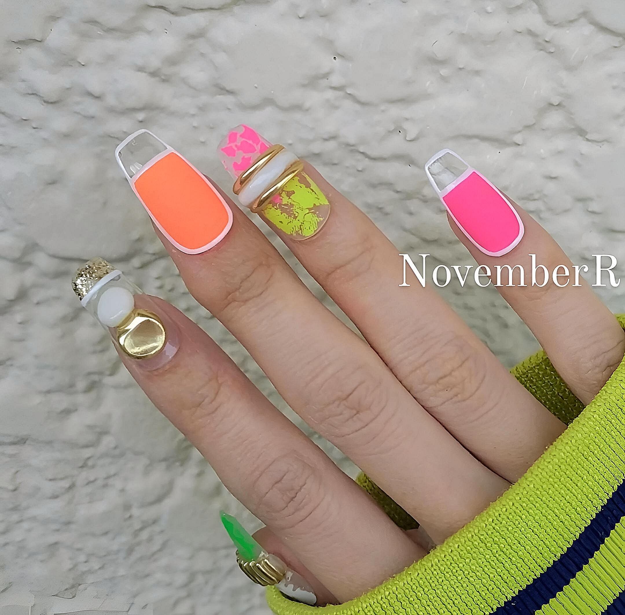 ネオンのホイルとカラー!クリア感もあるのでビーチやリゾートで活躍するカッコ可愛いマットネイル