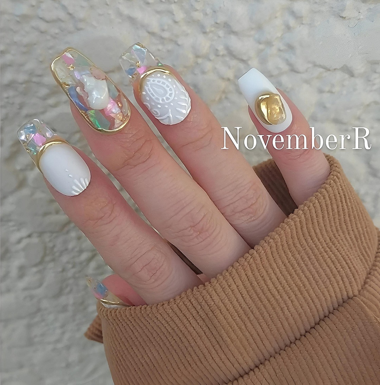 トレンドのクリアフレンチにパステルカラーのシェルが輝く全体的に落ち着いた大人ネイルチップ